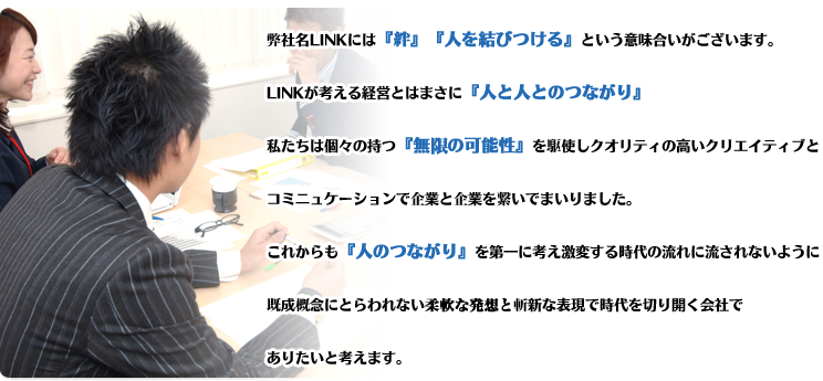 弊社名LINKには『絆』『人を結びつける』という意味合いがございます。